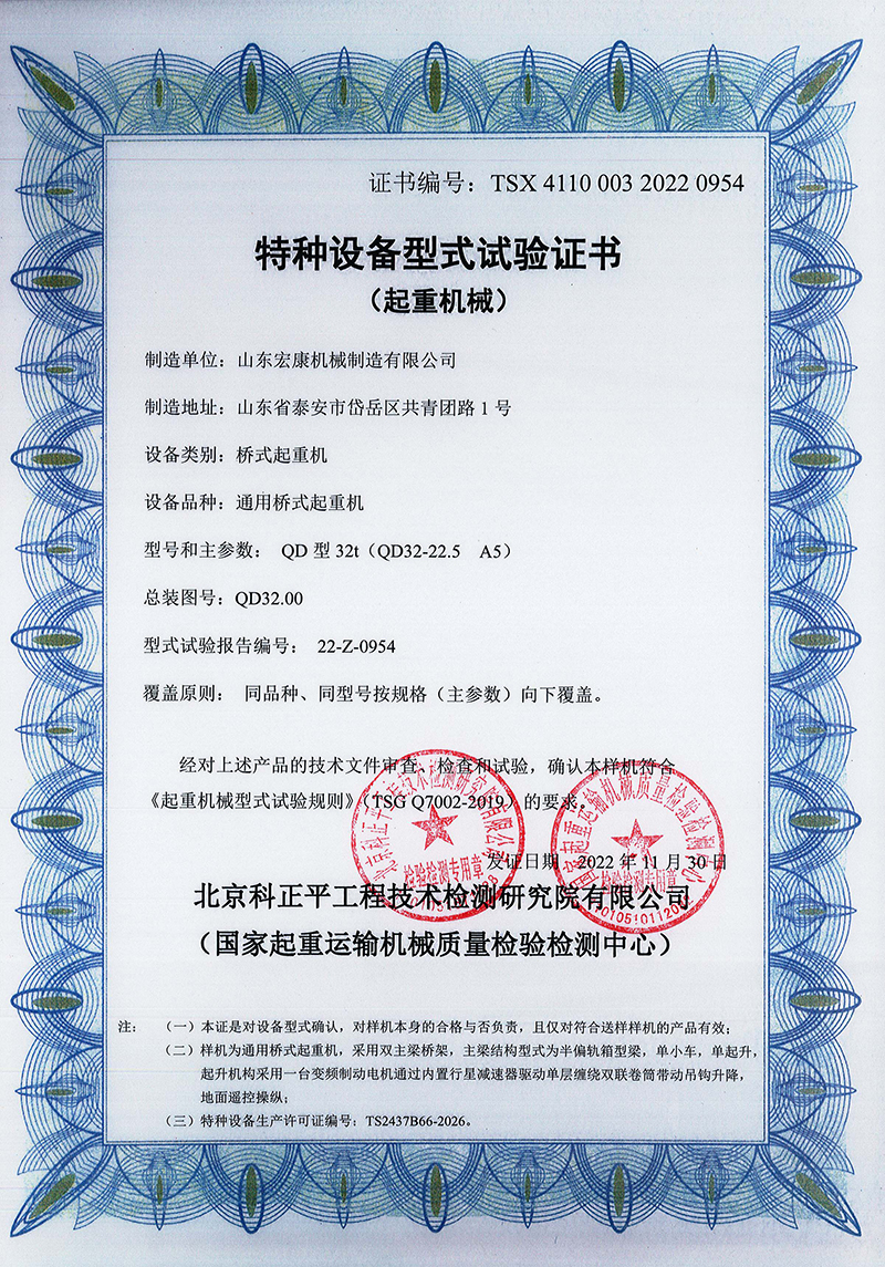 通用橋式起重機(jī)(雙梁)型式試驗(yàn)合格證
