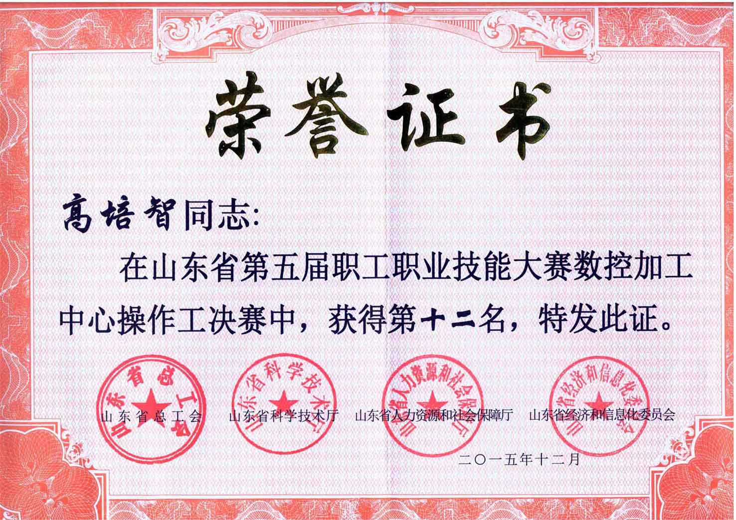 公司員工高培智在山東省第五屆職工職業(yè)技能大賽數(shù)控加工中心操作工決賽中,獲得第十二名,日前受到省總工會(huì)、省科技廳、省人力資源和社會(huì)保障廳和省經(jīng)信委四部門聯(lián)合表彰。